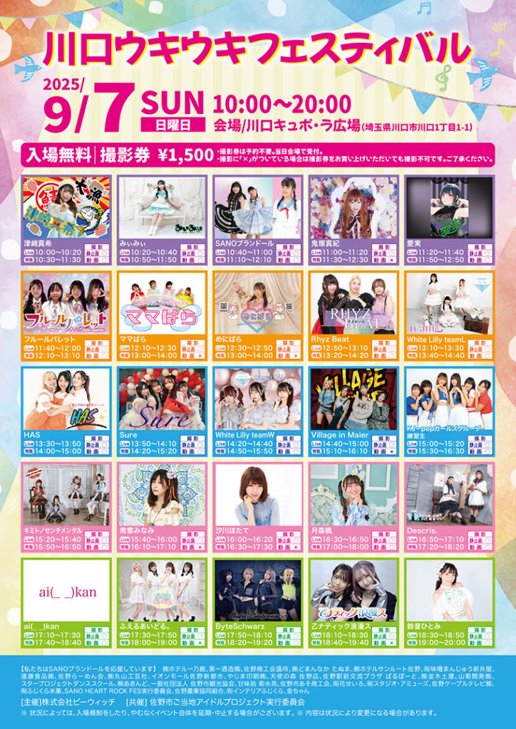 9月7日『川口ウキウキフェスティバル』 2025-08-03 最終更新日時 : 2025-08-23 sbd 【日時】2025年9月7日(日)10:00~20:00【会場】川口キュポ・ラ広場 (埼玉県川口市川口1丁目1-1) 入場無料!!撮影券¥1,500