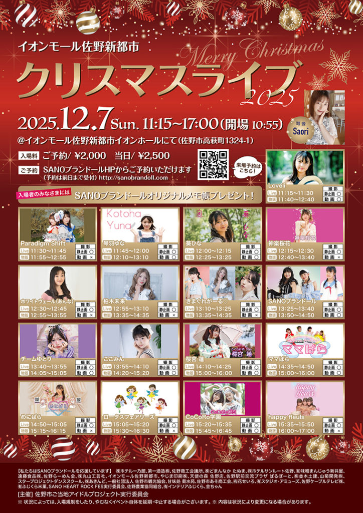 12月7日『クリスマスライブ2025』 2025-11-13 最終更新日時 : 2025-12-23 sbd 【日時】2025年12月7日(日)11:15~17:00【会場】イオンモール佐野新都市イオンホール (栃木県佐野市高萩町1324-1)【入場料】ご予約¥2,000/当日¥2,500