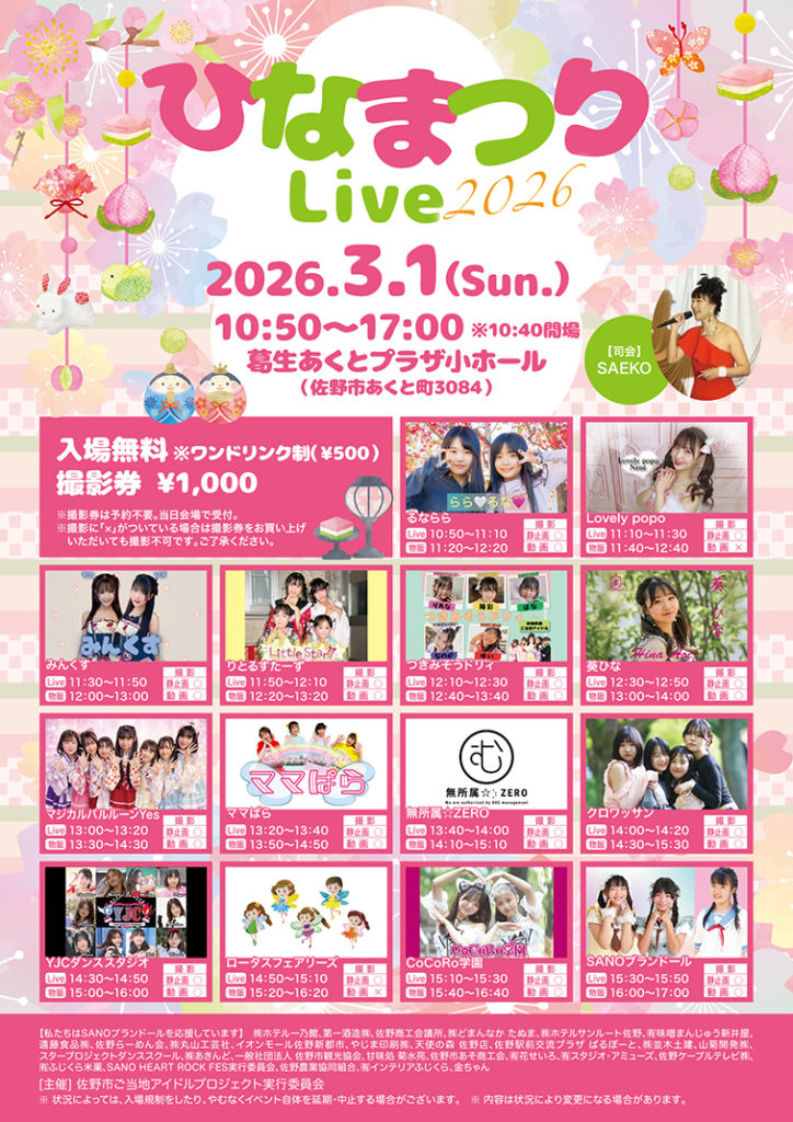 3月1日『ひなまつりLive2026』 2026-01-31 最終更新日時 : 2026-01-31 sbd 【日時】2026年3月1日(日)10:50~17:00【会場】葛生あくとプラザ小ホール (栃木県佐野市あくと町3084) 入場無料!ワンドリンク制¥500(撮影券¥1,000)