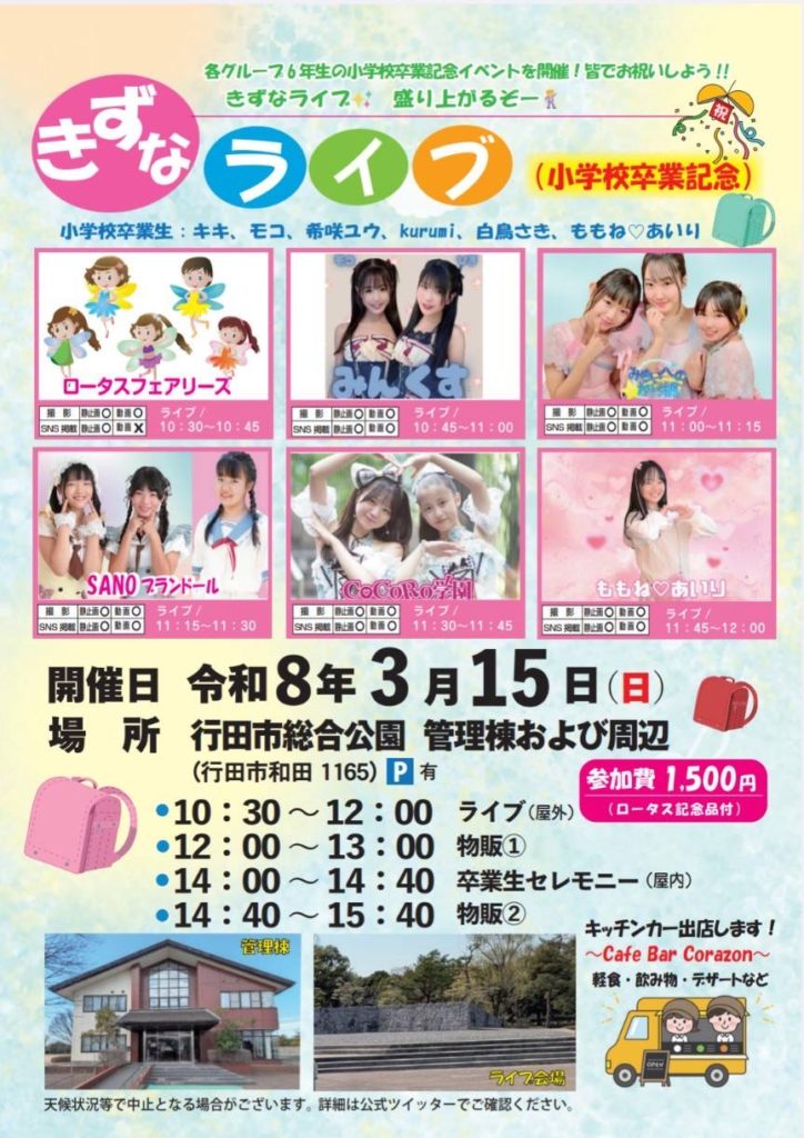 3月15日『きずなライブ☆小学校卒業記念』 2026-02-13 最終更新日時 : 2026-02-13 sbd 【日時】2026年3月15日(日)10:30~【会場】行田市総合公園 (埼玉県行田市和田1165) 【参加費】¥1,500(ロータス記念品付) みんなで卒業を祝ってね!